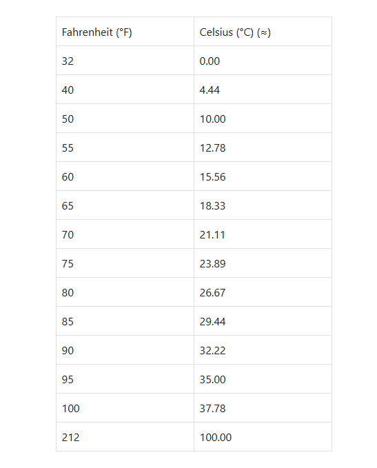 This expanded table uses the standard conversion formula: Celsius = (Fahrenheit - 32) × 5/9. It includes key reference points like the freezing (32°F) and boiling (212°F) points of water, along with temperatures commonly encountered in daily life—from cool weather to warm indoor settings. Whether you’re traveling, cooking, or tracking the climate, this table simplifies switching between the two scales.